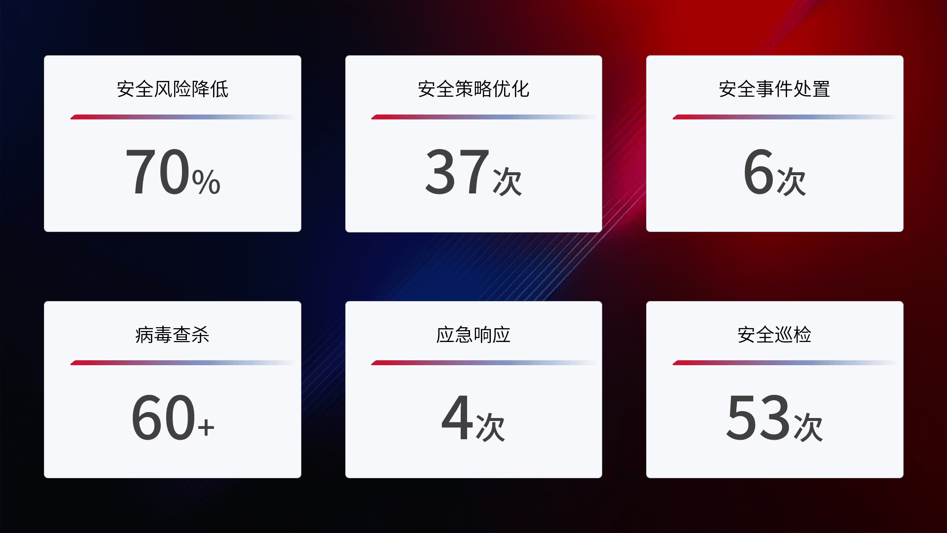 提供全面的安全事件报告体系,,,包括处置报告、、、、周报、、季度和年度总结,,,结合持续监控,,帮助客户深入了解网络安全状况。。。。